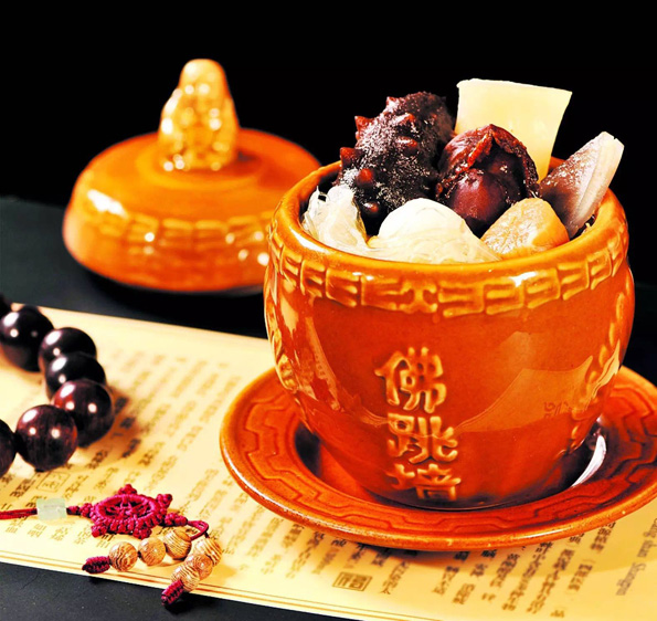 也稱“福壽全”,是用豬肚、雞鴨、羊肉、鴿蛋以及海產(chǎn)品等10多種材料,一起裝進紹興酒壇,然后煨制而成。一開酒壇,滿室幽香,個中滋味,回味無窮。
