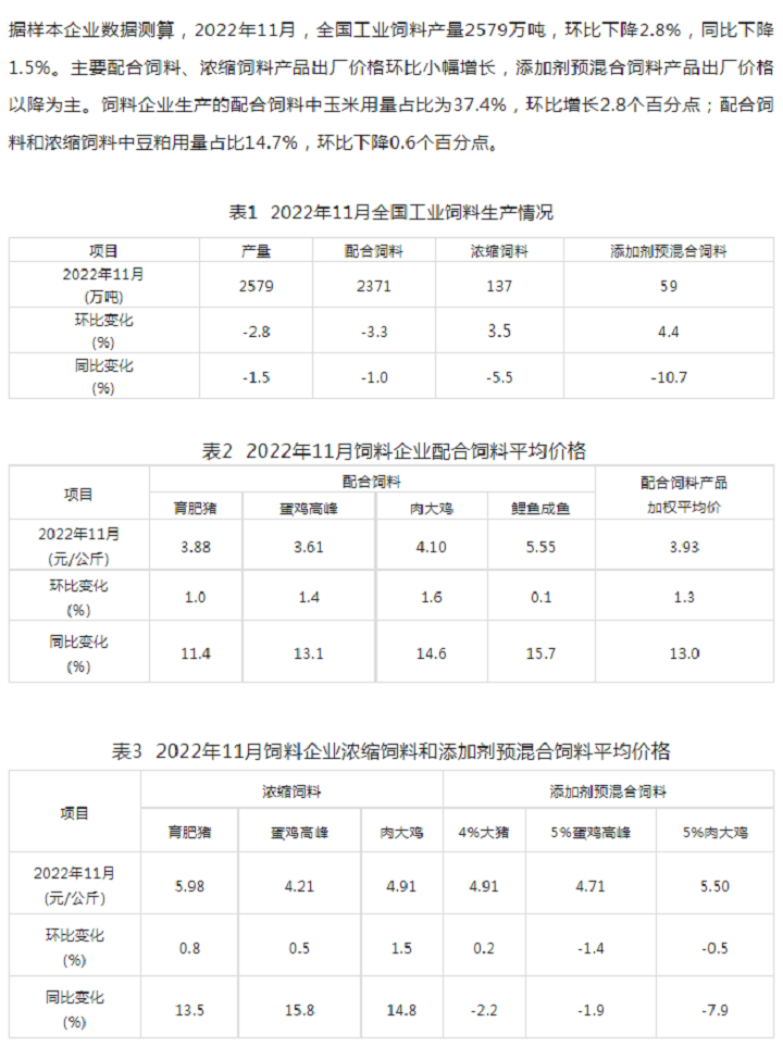 2022年11月份全國(guó)飼料生產(chǎn)形勢(shì)