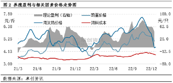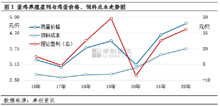2022年雞蛋、淘汰雞價(jià)格雙雙走高,但受飼料成本上漲拖累,盈利水平不及業(yè)者預(yù)期。2023年飼料成本將小幅下降,養(yǎng)殖盈利或提升。