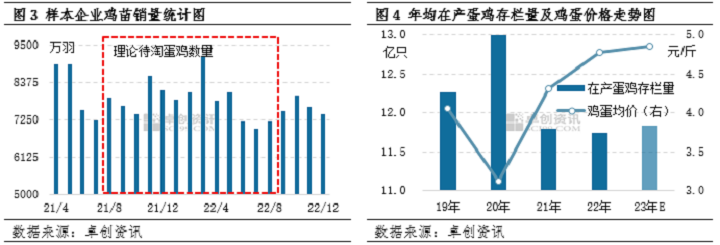 根據(jù)當(dāng)前存欄基數(shù)、補(bǔ)欄量以及補(bǔ)欄心態(tài)預(yù)判,預(yù)計(jì)2023年產(chǎn)蛋雞理論存欄量同比增加0.85%,蛋供應(yīng)較2022年略寬松,但仍低于正常水平(12億只)。