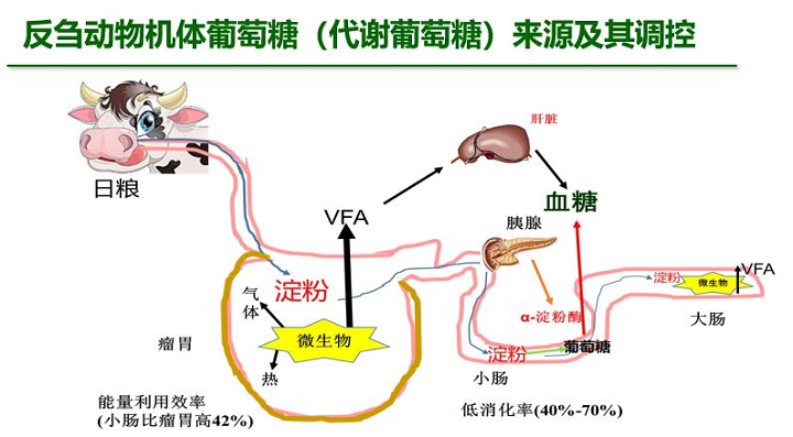 反芻動(dòng)物70%-80%的能量來(lái)源于揮發(fā)性脂肪酸(VFA),飼料中的碳水化合物如淀粉、果膠、果聚糖、可溶性糖、纖維素、半纖維素和木質(zhì)素,在瘤胃中被微生物降解產(chǎn)生能量、氣體(甲烷、二氧化碳)、熱量和酸。乙酸、丙酸和丁酸均屬于揮發(fā)性脂肪酸,它們構(gòu)成了瘤胃中產(chǎn)生的絕大部分酸(95%)。大部分丙酸在肝臟中被轉(zhuǎn)化成葡萄糖。另一方面,過瘤胃淀粉經(jīng)過淀粉酶的分解產(chǎn)生葡萄糖,通過小腸吸收進(jìn)入血液。