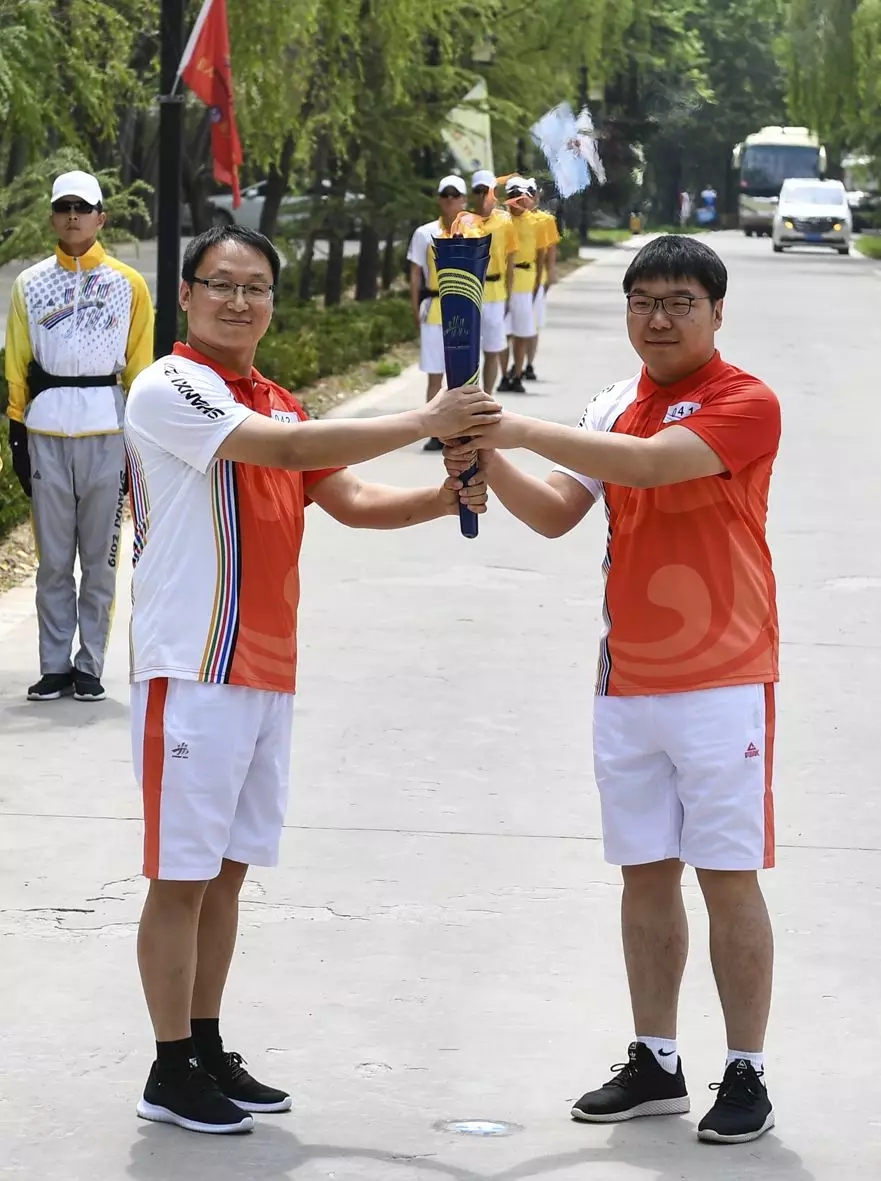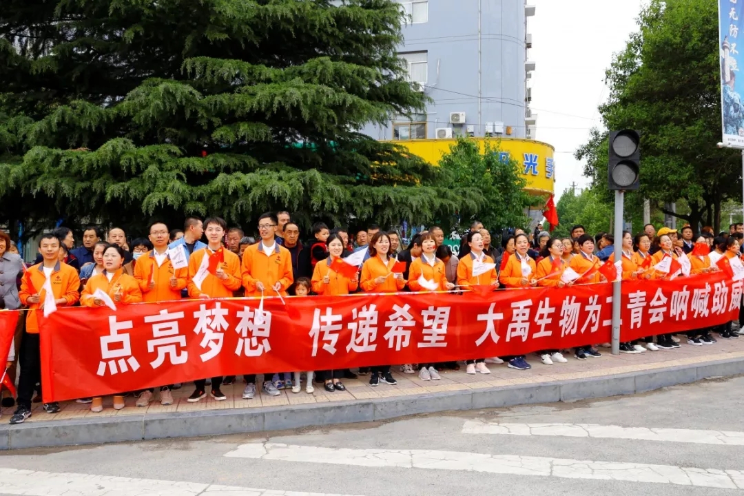 大禹生物職工代表手搖五星紅旗和“二青會”會徽“山河”旗幟,為圣火傳遞加油助威。