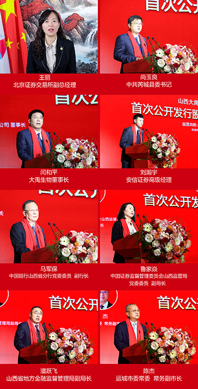 同時,還有大禹生物股東代表、董事、監(jiān)事、高管代表、特邀代表,中介機構(gòu)、客戶代表、員工代表,以及在大禹生物發(fā)展過程中予以我們支持、幫助、合作的各界伙伴,人民日報、新華社、中央電視臺、上海證券報、證券時報、山西日報、山西電視臺、山西新聞網(wǎng)等媒體的記者朋友。北京證券交易所副總經(jīng)理王麗女士通過視頻連線發(fā)來祝賀。