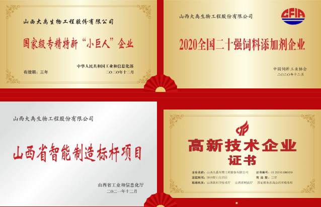 大禹生物成立于2014年,主營業(yè)務為飼料添加劑、飼料及獸藥的研發(fā)、生產(chǎn)與銷售。先后榮獲國家級專精特新“小巨人”企業(yè)、全國二十強飼料添加劑企業(yè)、山西省智能制造標桿項目、山西省質(zhì)量獎提名獎、山西省企業(yè)技術(shù)創(chuàng)新獎等榮譽。